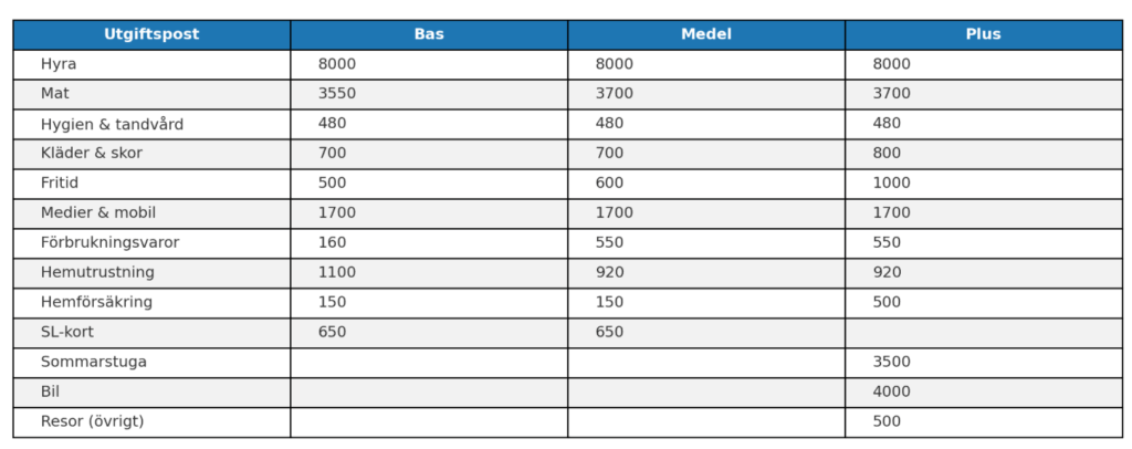 Flera av kostnadsposterna är liknande som i basbudgeten, men nivån på mat och fritid är något högre vilket speglar ett mer flexibelt ekonomiskt läge.