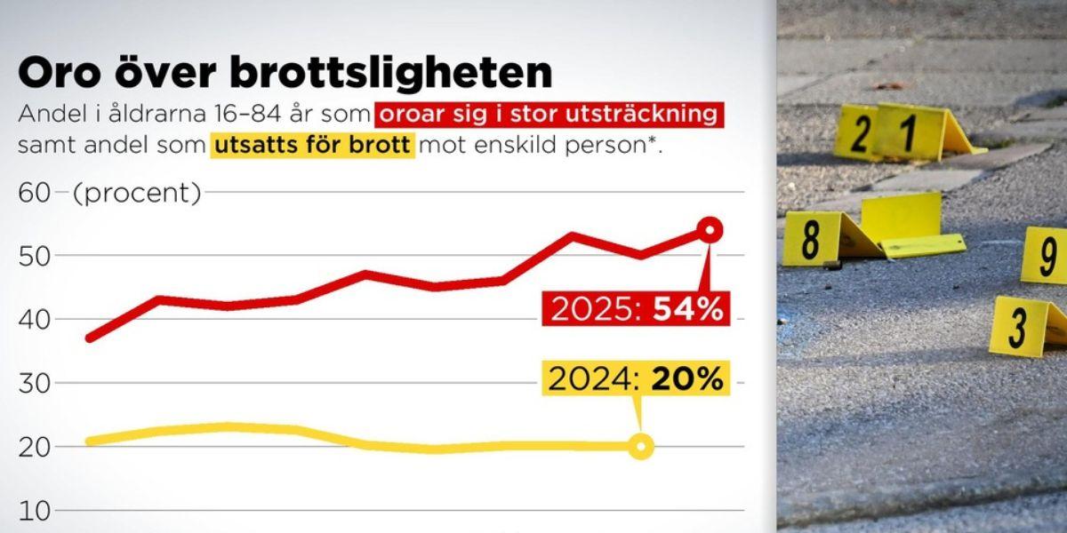 Andelen som är oroliga över brottsligheten i samhället har ökat från 28 procent 2014 till 54 procent 2025, enligt Brottsförebyggande rådet (Brå). Samtidigt ligger andelen som oroar sig för att själva utsättas för brott stabilt. Enligt undersökningen är oron över brottsligheten i samhället mer utbredd än rädslan för att själv utsättas.