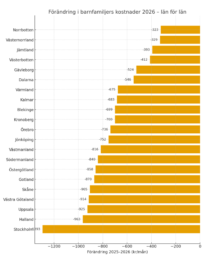 Det är främst Sveriges fyra elprisområden och lokala bostadspriser som driver de regionala variationerna. I Stockholm, där kostnaderna varit som högst, kommer barnfamiljerna att få den största lättnaden 2026. Där minskar utgifterna med i snitt 1 293 kronor per månad.
