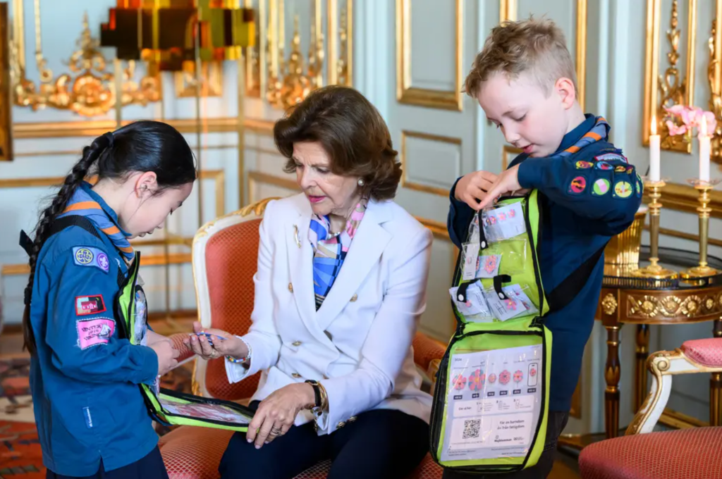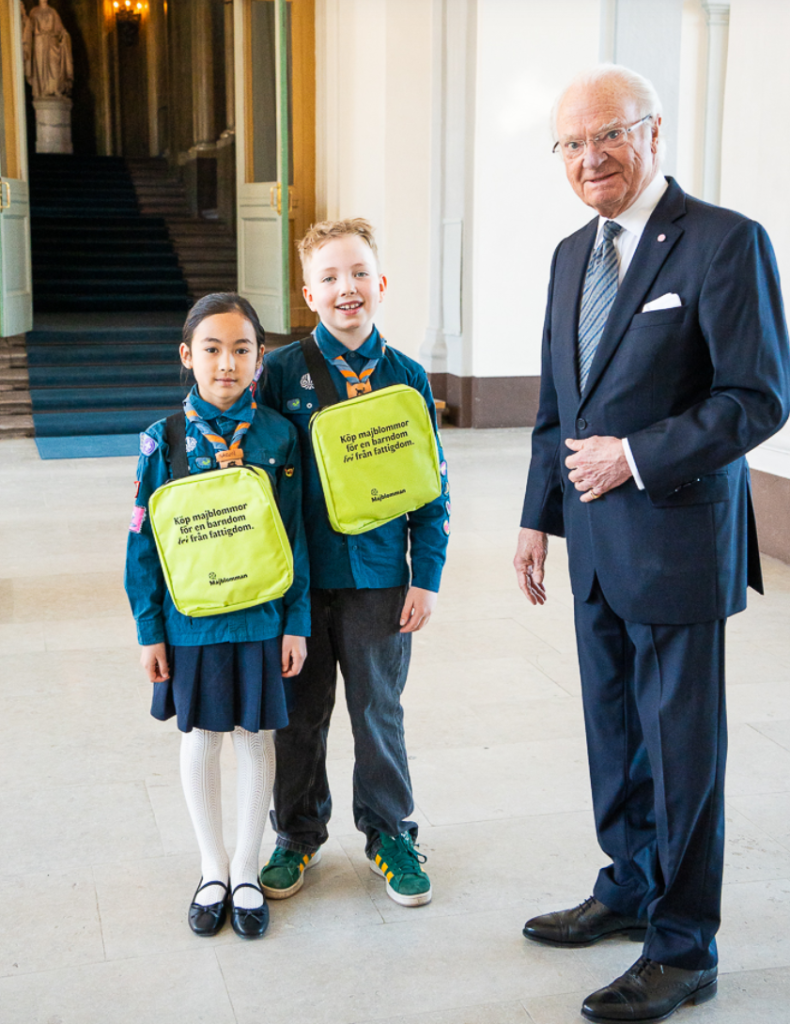 Drottningen Silvia, Majblommans högsta beskyddare, träffade idag de unga säljarna Naomi Riquelme Nagér, 8 år, och Verner Nyberg, 9 år, från Vällingby Scoutkår.