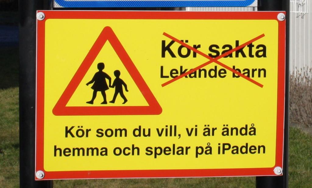 För en vecka sedan gick Lars Sylvan, 73, förbi en trafikskylt han inte tidigare sett i Söderköping. I stället för att bilisterna varnas för lekande barn poängterar skylten att bilisterna kan köra som de vill eftersom barnen ändå är "hemma och spelar på iPaden".