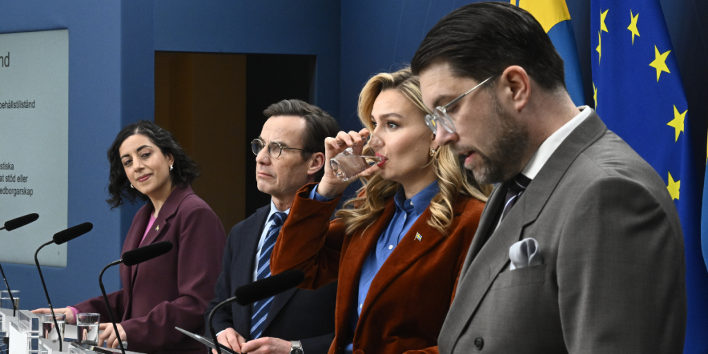 Under fredagsmorgonen håller Tidöpartierna pressträff på migrationsonrådet. Med på pressträffen är partiledarna Ulf Kristersson (M), Jimmie Åkesson (SD), Ebba Busch (KD) och Simona Mohamsson (L).