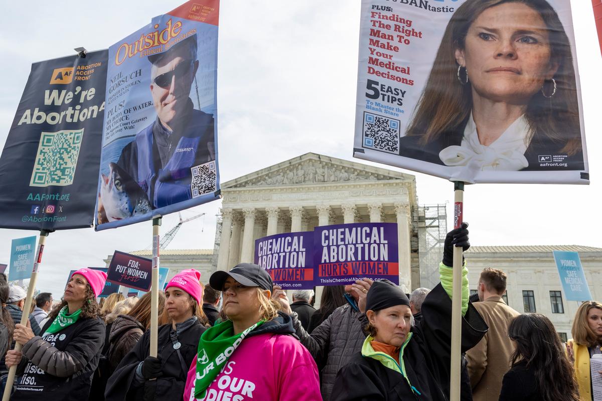 Protester för och emot aborträttigheter utanför USA:s högsta domstol i mars. Arkivbild. (Foto: Amanda Andrade-Rhoades/AP/TT)